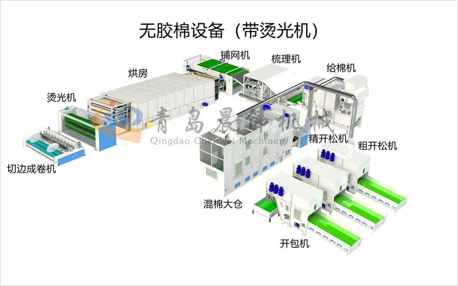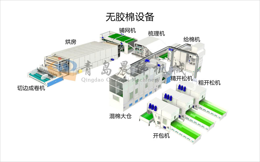 开包机-开松机-振动给棉机-梳理机-铺网机-烘房-切边成卷机
