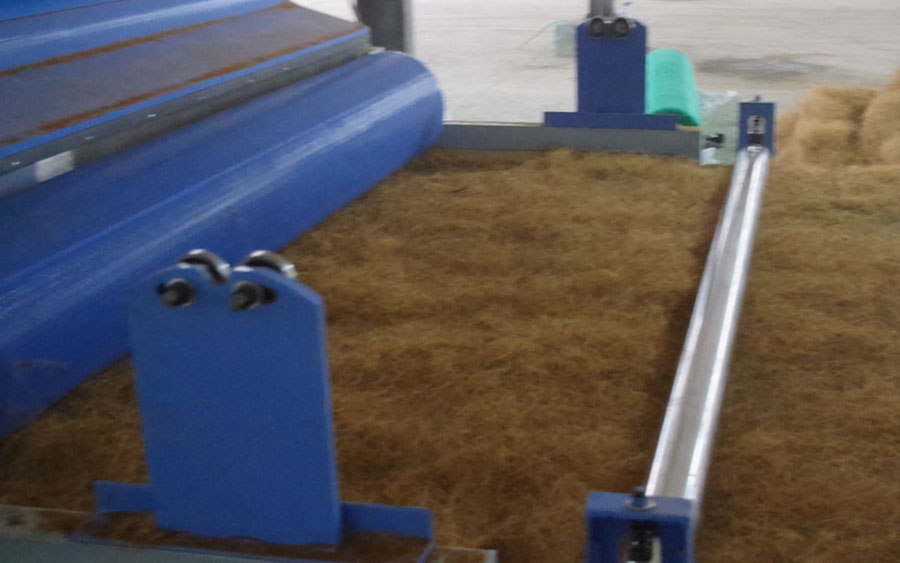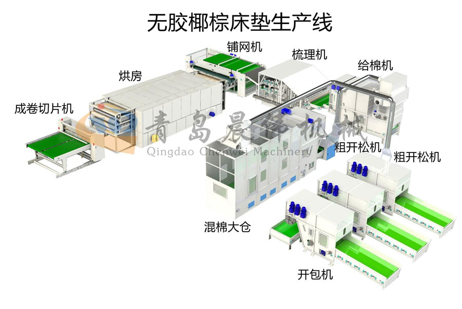 本生产线是利用椰棕纤维和胶水通过高温热风穿透粘合定型,通过压板机多层压实而成,椰棕垫是床上用品、服装家具、沙发高级的芯垫材料。