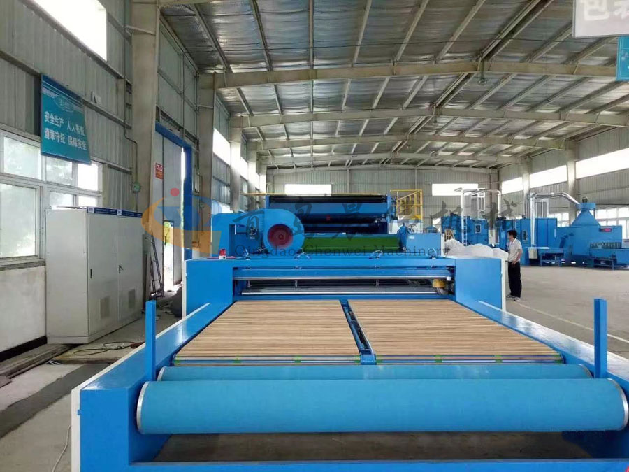 5. CWPW-铺网机:用于将梳理纤网通过移动小车交叉折叠为所需幅宽和定量的多层纤网,以供后道工序使用。铺网辊采用特殊结构,加装压网辊和导流板,不飘网不起皱,五只大功率电机精确控制各部件的运动,电动输出帘高度调节装置