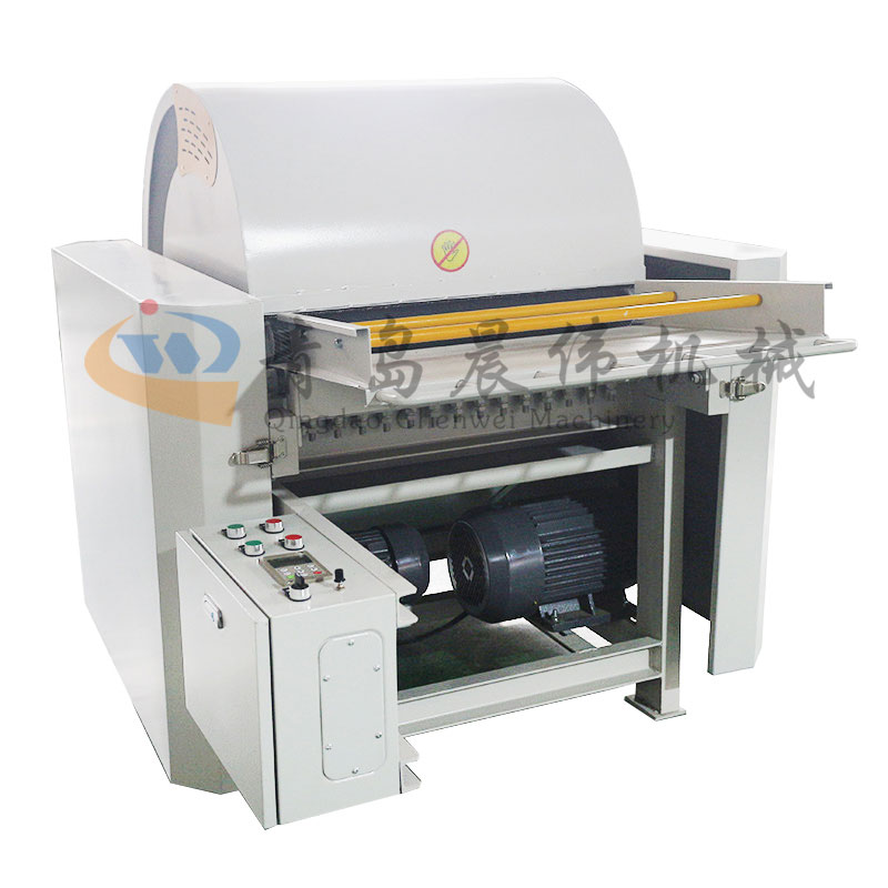 开松机:本机开松效果好,不易缠棉,产量高。把纤维、原料经喂入平帘输送至喂入罗拉,再由开松辊高速开松后,经输棉风机以适量的风量输送纤维原料供后道工作使用
